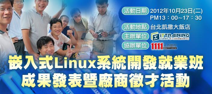 「嵌入式Linux系統開發就業班」於2012年7月24日開訓,透過三個月專業且密集的培訓,屆已結訓,謹訂於2012年10月23日(二)舉辦「嵌入式Linux系統開發就業班成果發表暨廠商徵才活動」,透過本班之成果發表,企業單位可親自觀摩本班之培訓成果,更可實際審閱本班學員各方面優異的表現與能力,誠摯敬邀企業各界的蒞臨參觀與指教。我們也歡迎企業單位於現場徵才,將提供您最具即戰力的研發人才。