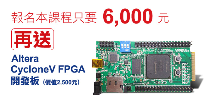 本課程以FPGA 供應商AlteraCyclone V,設計一個基於軟核NiosII 的SoC FPGA 的解決方案。課程包含Nios II、時脈、中斷、週邊通訊、暫存器Memory Map 等規劃;在軟體部份,說明Nios II 32-bit RISC架構及指令集並利用EDS 建構嵌入式系統軟體。本課程以強調實作為主,以BeMicro CV kit (Altera Cyclone VFPGA ) 平台作為本課程實作訓練。