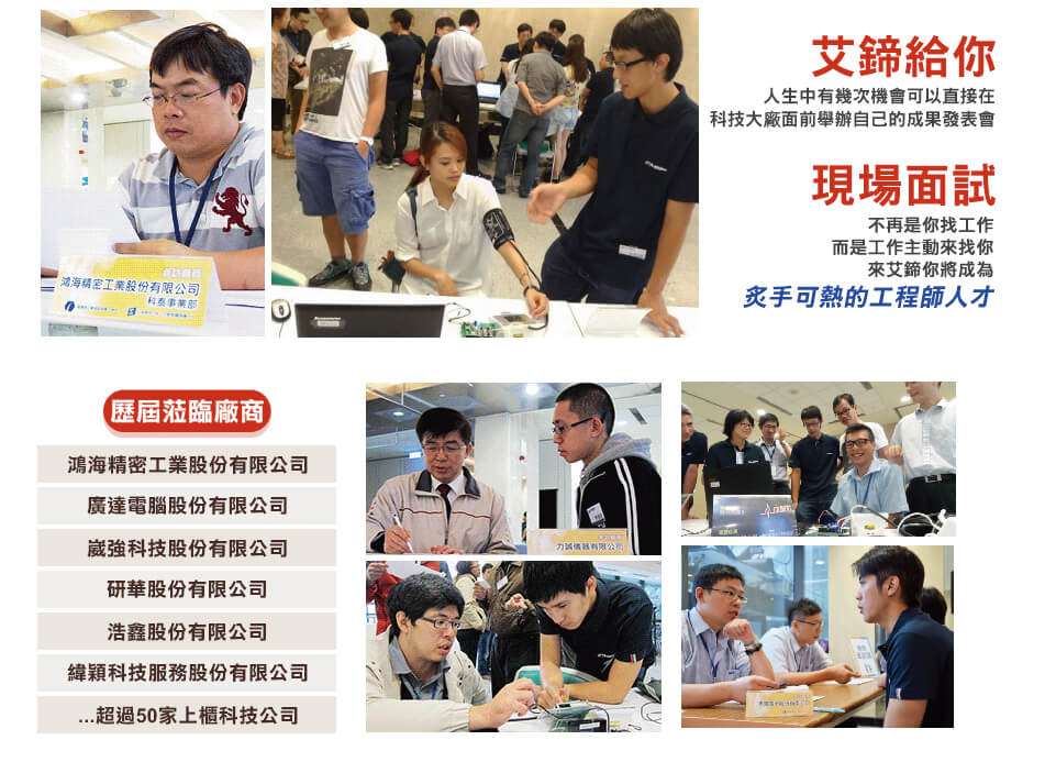 | 醫電班的就業方向 | 醫療電子韌體工程師、醫療器材工程師、醫療器材研發工程師、醫療產品測試工程師、醫療法規人員、電路設計工程師、韌體工程師/FW工程師、技術服務工程師、 系統開發人員、研發類資訊工程師、軟體工程師等 |